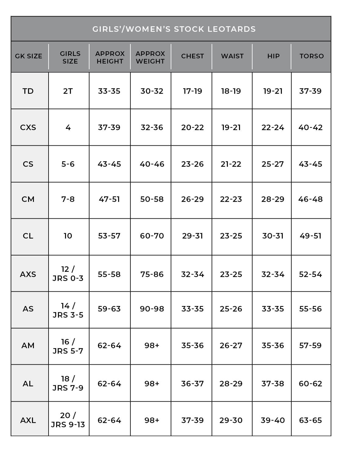| Hip (cm) | 78 – 84 | 84 – 91 | 91 -98 | 98 – 105 | 105 – 112 | 112 – 120 | 120 – 128 | 118 – 128 | 128 – 138 | 138 – 148 |