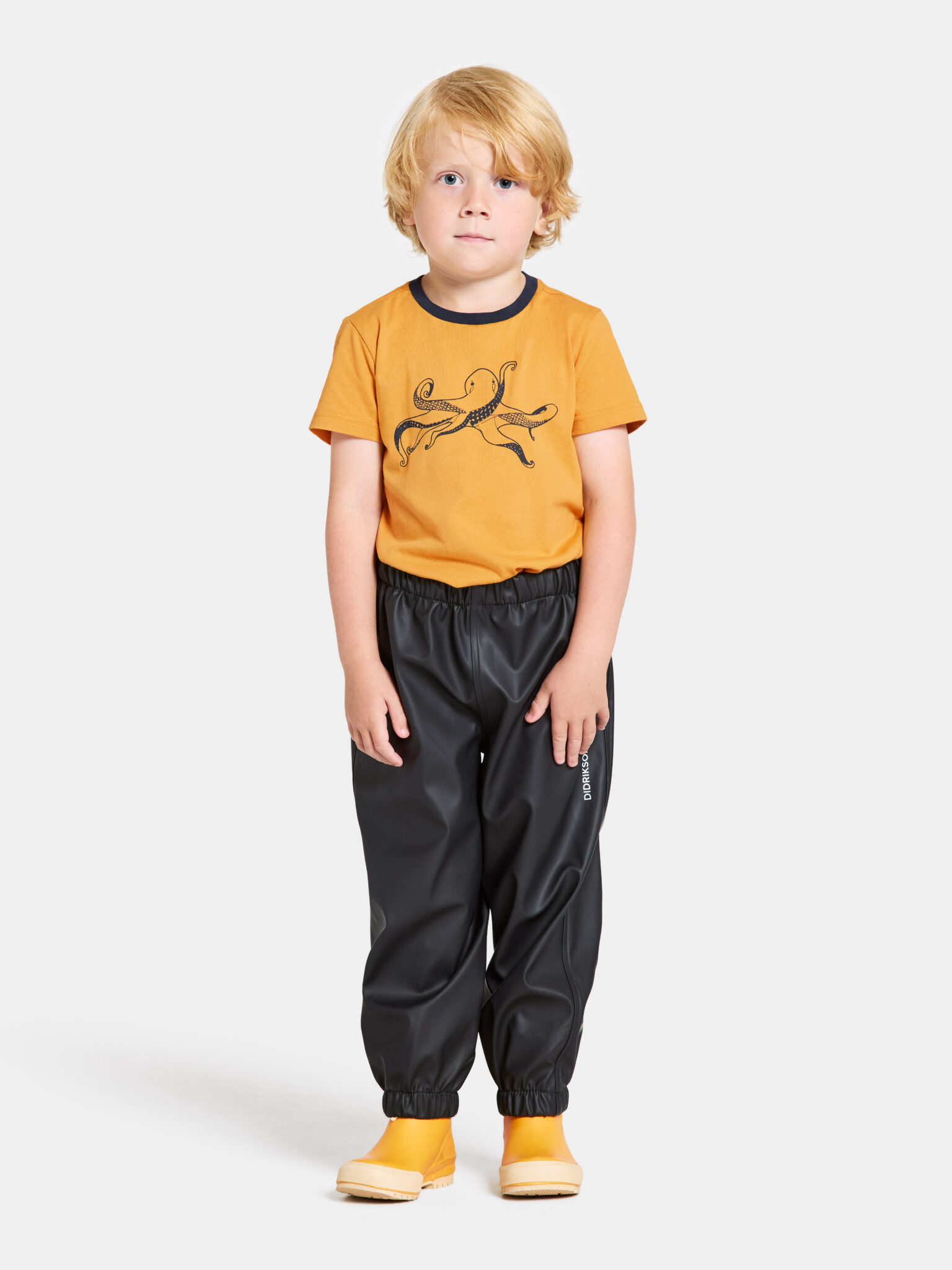 The waist is elastic and can be adjusted from the inside with buttons for a perfect fit. The trousers have elastic leg ends that keep out moisture and dirt. The garment is made of PVC-free Galon® and has a name tag with space for several names. Midjeman is a practical and durable pair of trousers ideal for play and adventure.